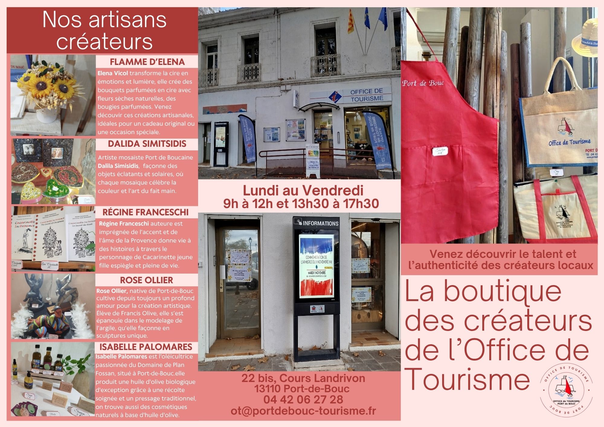 ✹ Ne cherchez plus ! La Boutique des CrĂ©ateurs de l’Office de Tourisme de Port-de-Bouc vous ouvre exceptionnellement ses portes toute la semaine de 9h Ă  12h et de 13h30 Ă  17h30, ainsi que les 22, 23 et 24 dĂ©cembre, aux mĂȘmes horaires.