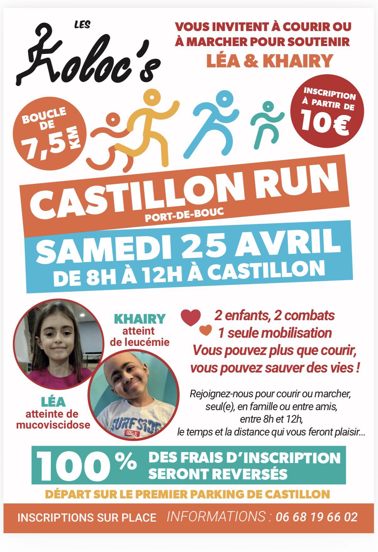 Organisé par les Koloc’s qui vous invitent à courir ou à marcher pour soutenir Léa&Khairy le samedi 25 Avril à 8h – Départ du premier parking de Castillon