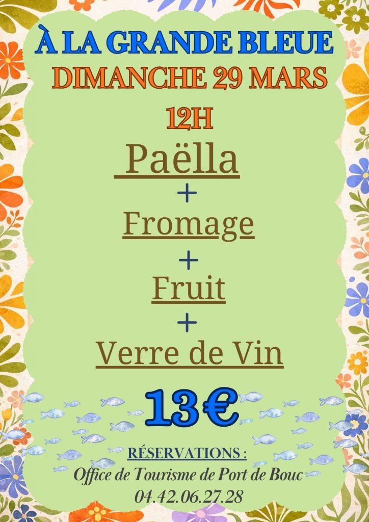 Terramar – Dimanche 29 Mars 3 mars 2026 Accueil Leave a comment *** Terramar – Dimanche 29 Mars 2026 *** Dimanche 29 Mars 2026, lors de notre manifestation « Terramar », le bar La Grande Bleue vous propose un repas à 13€ avec Paëlla + Fromage + Fruit + Verre de vin ou eau. Réservations : Office de Tourisme Port de Bouc au 04.42.06.27.28 Navigation de l’article Previous Post*** Vidéo Totem – OTPDB ***Next Post𝐆𝐑𝐀𝐍𝐃𝐄 𝐌𝐀𝐑𝐂𝐇𝐄 𝐏𝐎𝐔𝐑 𝐋’𝐄́𝐆𝐀𝐋𝐈𝐓𝐄́